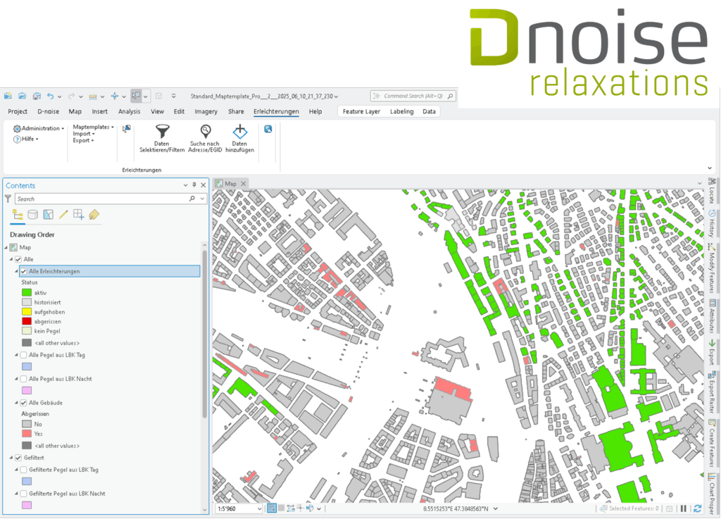 D-noise ist eine GIS-Lösung zur Simulation und Beurteilung von Umgebungslärm. Über D-noise können Lärmbelastungskataster erstellt und mögliche Lärmszenarien berechnet werden. D-noise basiert auf der Lösung ArcGIS Pro von Esri und bietet ein breites Spektrum an Funktionalität für alle Arbeitsschritte von der Datenaufbereitung über die Lärmberechnung bis hin zu Auswertungen, der Erstellung von Berichten und der Publikation der Resultate. Eine Vielzahl von Schnittstellen ermöglichen die Bereitstellung der Resultate auf Geoportalen, die Ausgabe im Format des Minimalen Geodatenmodells für Haupt- und Übrige Strassen, oder die Weiterverwendung der Daten mit D-noise web services.